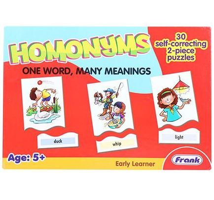 Homonyms is an exciting puzzle set for youngsters. The 30, two piece puzzles are designed to help improve their vocabularly and learn about words that are the same but have different meanings. Children will have laods of fun while assembling the brightly illustrated puzzle pieces. The puzzle pieces are self correcting (can only fit together the correct way) hence ensuring that the concept is learnt correctly right from the start. The additional feature of 'play plus' offers fresh and innovative ideas for further practice through fun-filled activities.