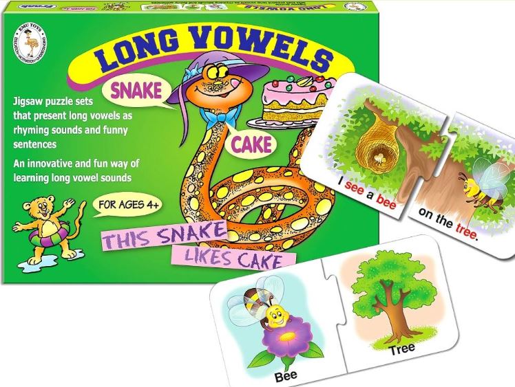 This Long Vowels Puzzle Set comprises of 20 interesting sets of double-sided, two-piece puzzles of rhyming long vowel words and sentences. This set of two piece puzzles help kids learn long vowels in a fun and engaging way by helping your child to learn simple words with short vowel sounds the phonic way. The additional feature of 'play plus' also offers ample scope to build upon phonics and vocabulary with fun activities and games.