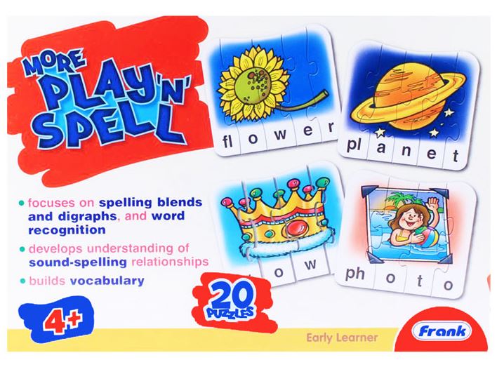 More Play 'n' Spell word puzzles develop childrens understanding of sound-spelling relationships by focusing on introducing children to two key elements of learning to read - letter blend sounds (e.g. flower, crown) and digraphs, a two letter combination that sound completely different from the constituent letters (e.g. sheep, cheese). The 20 jigsaw puzzles are self correcting (can only fit together in the correct order). The additional feature of 'play plus' offers ideas for further fun activities and games to encourage more practice and development of word recognition and build vocabulary.