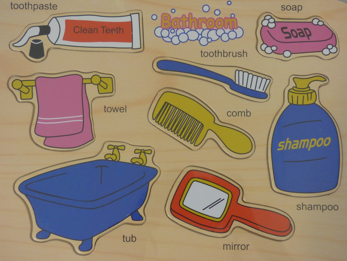 Teach children about recognising different items and products that belong in the bathroom with this bright coloured wooden puzzle.
