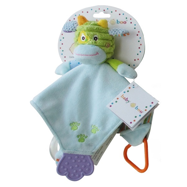 This adorable Cow Cuddle Blnaket by Babyboo is made from bright textured panels and has a rattle ring, a textured teething pad, a teething triangle and knotted tab on the coners of the blanket. All these stimulating features are securely sewn in place and the bright smiling cows face has been embroided into the material making the cuddle blanket safe for the smallest of hands and teeth.