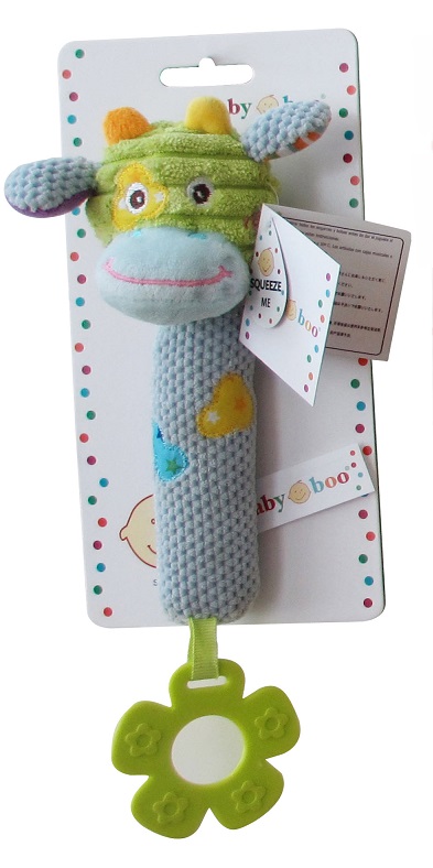 This adorable Cow Squeeker with teething ring by Babyboo, is a soft and colourful hand toy designed to accommodate baby's ability to hold objects. When your child squeezes the Cow's tummy it makes a pleasant squeeking sound!