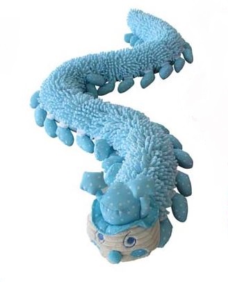 - has 52 legs and satin feet, a tail and a head (with hat), polkadot antennas, embroidered eyes and smile,