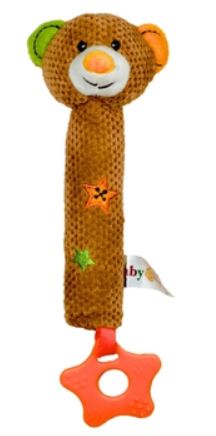 This adorable Brown Bear Squeeker with teething ring by Babyboo, is a soft and colourful hand toy designed to accommodate baby's ability to hold objects. When your child squeezes the Bear's tummy it makes a pleasant squeeking sound!
