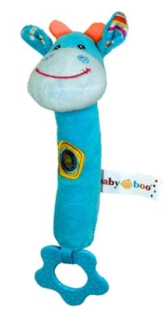 This adorable Blue Cow Squeeker with teething ring by Babyboo, is a soft and colourful hand toy designed to accommodate baby's ability to hold objects. When your child squeezes the Cow's tummy it makes a pleasant squeeking sound!