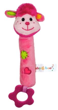 This adorable Pink Lamb Squeeker with teething ring by Babyboo, is a soft and colourful hand toy designed to accommodate baby's ability to hold objects. When your child squeezes the Lamb's tummy it makes a pleasant squeeking sound!