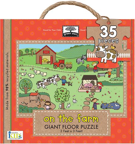 When the puzzle is completed, they can use the key on the back of the box for some seek-and-find fun and get a close up look at the animals on the farm. This 35-piece giant floor puzzle made of thick recycled materials and printed with eco-friendly inks.