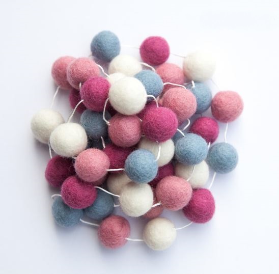 This beautiful garland with berry bubble coloured balls has been handmade in Nepal under ethical fairtrading and conditions, using 100% NZ wool. They are hand-dyed, hand-felted, and stitched with love, in the most beautiful shades. They can be draped over a bed-head, across a mantel, over your window or as bedroom decoration, or be placed just about anywhere!