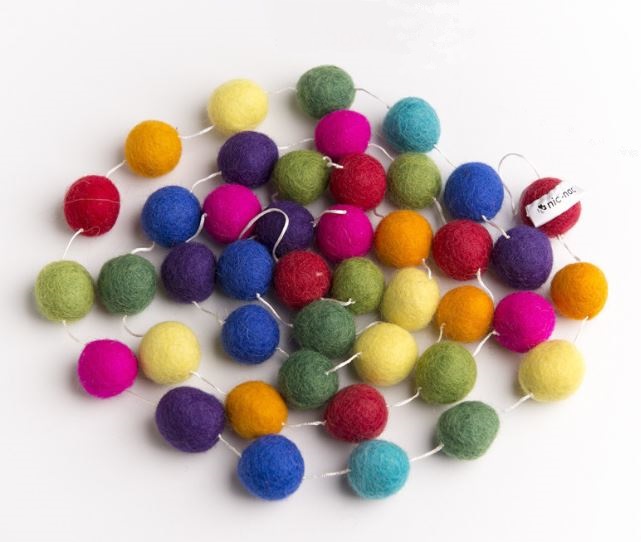 This beautiful garland with rainbow balls has been handmade in Nepal under ethical fairtrading and conditions, using 100% NZ wool. They are hand-dyed, hand-felted, and stitched with love, in the most beautiful shades. They can be draped over a bed-head, across a mantel, over your window or as bedroom decoration, or be placed just about anywhere!