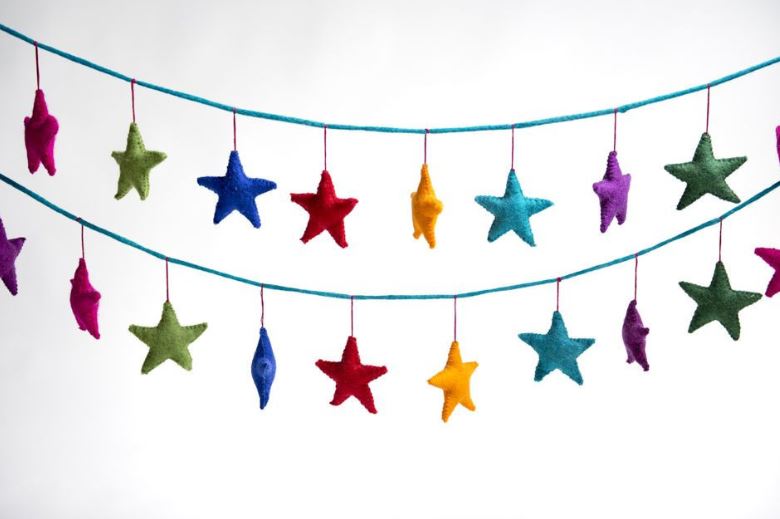 This beautiful garland with rainbow stars has been handmade in Nepal under ethical fairtrading and conditions, using 100% NZ wool. They are hand-dyed, hand-felted, and stitched into little pockets stuffed with love, in the most beautiful shades. They can be draped over a bed-head, across a mantel, over your window or as bedroom decoration, or be placed just about anywhere!