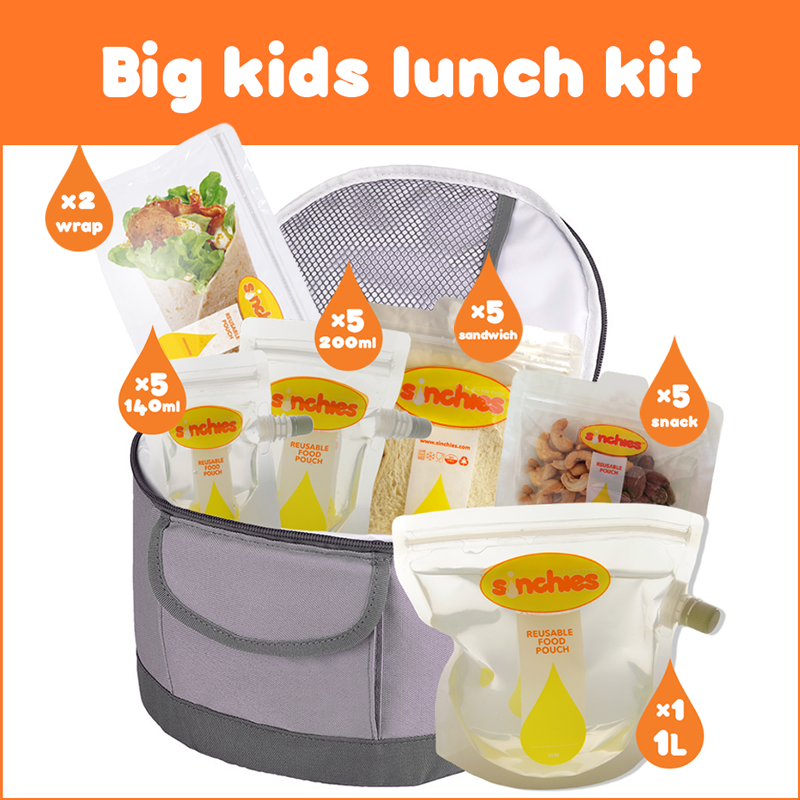 Sinchies - Big Kids - Lunchbox Kit - 5 x 140mL pouches, 5 x 200mL pouches, 5 x snack bags, 5 x sandwich bags & 2 x wrap bags