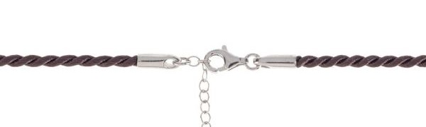 Brown twisted synthetic silk necklace, 3mm in diameter, with cast sterling silver caps, clasp and 45cm in length with 6cm of extension chain. This versatile necklace gives the wearer the ability to adjust the length to suit their own personal style.