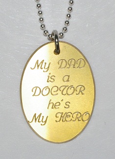You may choose from three different engraving fonts for "My Dad is a Doctor he's my Hero" and you may also dedicate the back side of the tag for a personalised message, like who the tag is from and a date if you wish. Just remember the more letters used in your message, the smaller the font will need to be engraved. Please enter all the details you wish to have on your tag in the 'Customer Notes' section during the completion of your purchase.