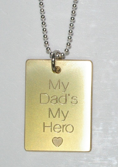 You may choose from three different engraving fonts for "My Dad's My Hero" and you may also dedicate the back side of the tag for a personalised message, like who the tag is from and a date if you wish. Just remember the more letters used in your message, the smaller the font will need to be engraved. Please enter all the details you wish to have on your tag in the 'Customer Notes' section during the completion of your purchase.
