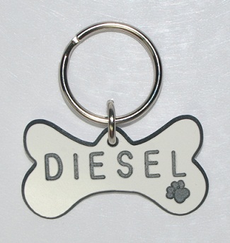 This hardened plastic Bone Dog ID Tag is designed for those who have dogs that love nothing more than to chew on a bone. This tag is 37mm x 21mm (slight deviations to these measurements may occur due each tag being individually handcrafted) with a 22mm split ring.