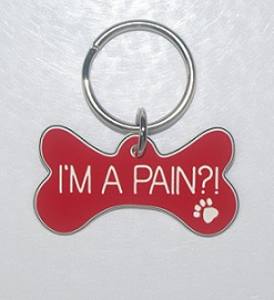 This hardened plastic Bone Dog ID Tag with "I'm A Pain?!" engraved on the front is designed for those who have dogs that love nothing more than to chew on a bone and for owners with a sense of humour. This tag is 37mm x 21mm (slight deviations to these measurements may occur due each tag being individually handcrafted) with a 22mm split ring.