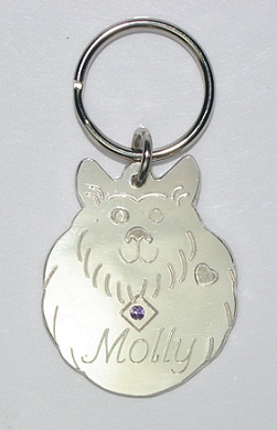 This sterling silver Fluffy Dog ID Tag is designed for those who love their long haired dogs. To make this tag even more special it is set with a 2mm round brilliant-cut Purple Cubic Zirconia. This is high quality purple cubic zirconia adds some 'bling' to your beloved dogs look. This tag is 28mm x 34mm x 1.6mm (slight deviations to these measurements may occur due each tag being individually handcrafted) with a 22mm split ring. Tarnish resistant sterling silver is used to make the tag, so it takes a longer time to become tarnished.