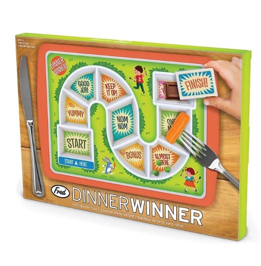 Dinner Winner makes food fun! The goal is to get to the finish line, where a special covered treat awaits, so even fussy eaters will clean their plate! Dinner Winner is molded from 100% virgin melamine, BPA free, food-safe and dishwasher-safe.