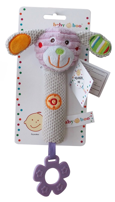 This adorable Dog Squeeker with teething ring by Babyboo, is a soft and colourful hand toy designed to accommodate baby's ability to hold objects. When your child squeezes the Dog's tummy it makes a pleasant squeeking sound!