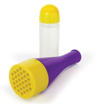 To create many touchable bubbles it as simple as gently squeezing a small amount of bubble liquid onto the yellow cap of the bubble blower and spreading it to cover all the holes. Then blow into the bubble blizzard when pointing it high into the air. Wait a few seconds and then catch the bubbles as they fall.