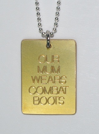 You may choose from three different engraving fonts for "Our Mum Wears Combat Boots" and you may also dedicate the back side of the tag for a personalised message, like who the pendant is from and a date if you wish. Just remember the more letters used in your message, the smaller the font will need to be engraved. Please enter all the details you wish to have on your tag in the 'Customer Notes' section during the completion of your purchase.